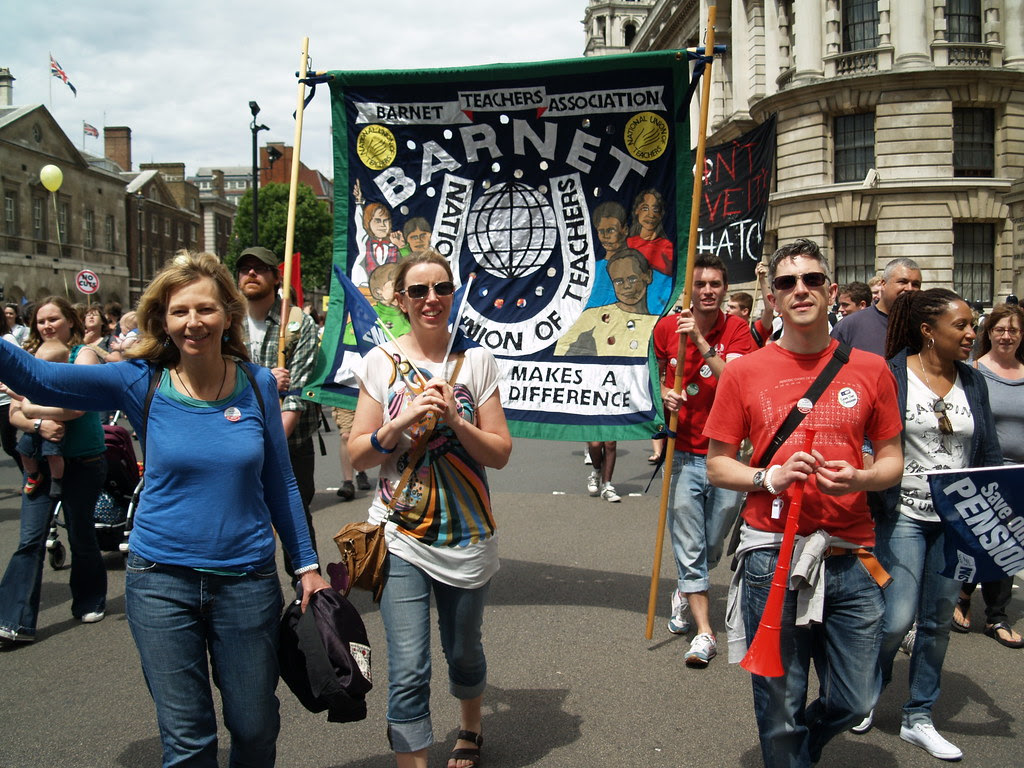 JUNE – among the Conservative and Lib Dem government’s many attacks on working people, their plans to make public sector workers work longer, pay more and get less in pensions began to provoke anger among trade unionists. NUT, PCS, UCU and some smaller unions all struck on 30 June. Here is Barnet NUT on the central London march that day.